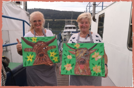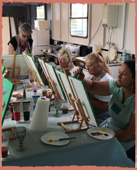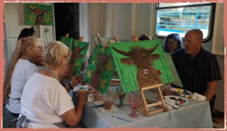 Die Farben, Leinwände, Tischstaffelein und Utensilien werden von mir mitgebracht, Ihr benötigt nur den passenden Raum mit Tischen und Stühlen (beim Lieblingswirt im Extrastüberl, im Gemeindezentrum oder im Stadel.....) fast alles ist möglich.